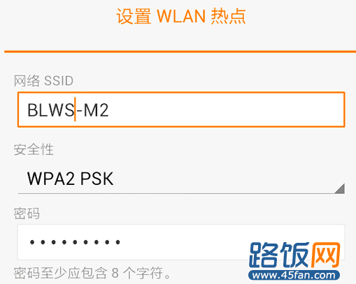 3、进入“网络共享”,就是在这里配置WIFI热点的各项参数了,SSID就是网络名称,供对方搜索用,安全性就保持默认的WPA2,然后输入一个密码供对方连接时用: