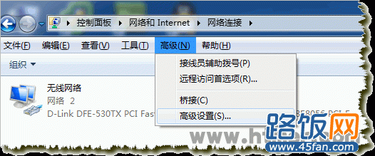 2.然后在“网络连接”窗口中点击“高级”菜单,选择“高级设置”,如果没有菜单栏,请按Alt键呼出菜单栏,相关截图如下所示:
