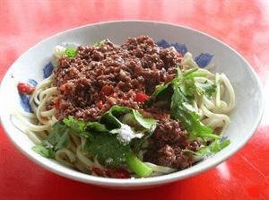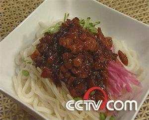 2、将面条煮熟后捞出,淋入炸好的酱即可。
