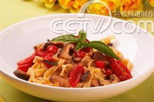 3、锅中放入橄榄油,加入红椒、香菇、西红柿、迷迭香碎,将煮好的面条放入翻炒均匀,调入胡椒粉、盐即可。
