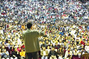 9月26日下午,为了出席次日举行的郑州新东方学校开业典礼,俞敏洪一行来到了郑州。当天晚上他们在郑州大学升达经贸管理学院进行了一场名为“感受魅力英语,成就辉煌人生”的演讲。当记者赶到时,能容纳2000多人的礼堂座无虚席,就连走廊和舞台两侧的空地也挤满了人。