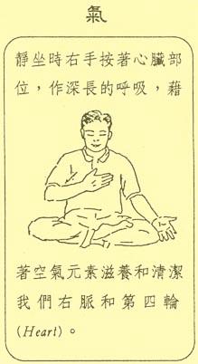 静坐练习一阵子后,会知觉手指与手掌发出讯息,若一只手感到凉快及轻些便要平衡身体。提升左边降下右边或是提升右边降下左边,直至两手平衡。