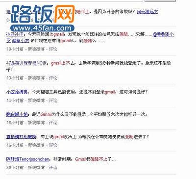 这两天,最让笔者苦恼的事情莫过于gmail邮箱登陆不上,有的时候登陆上了,但想发邮件或收邮件,立马断开了。笔者百度查看了相关搜索,结果微博上很多朋友同笔者有一样的情况,截图如下: