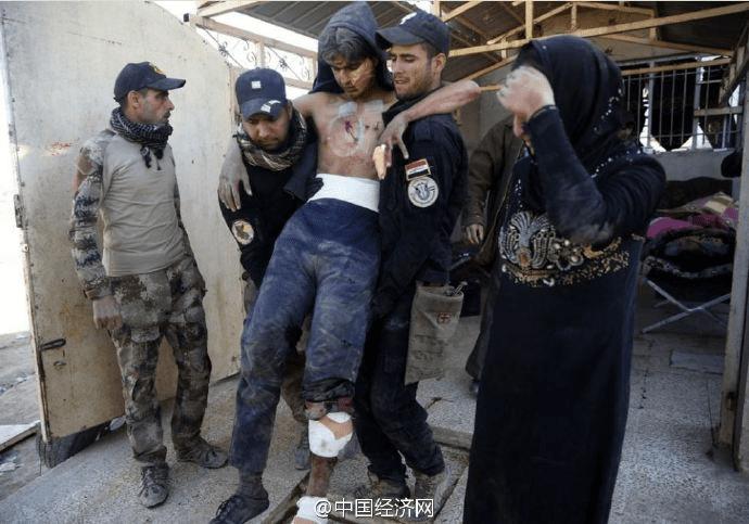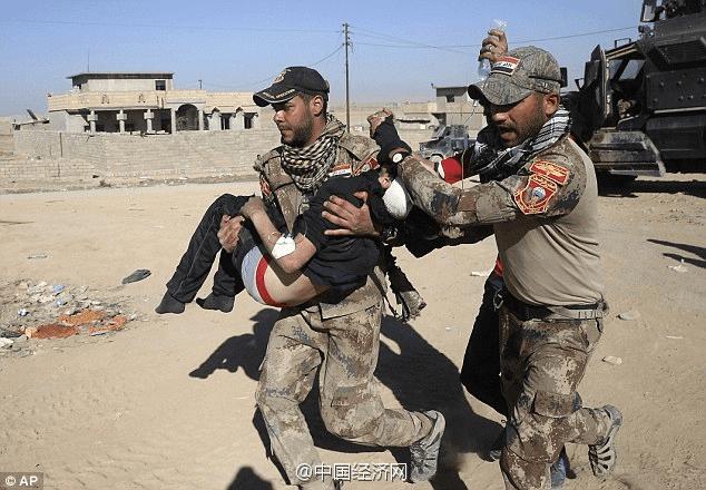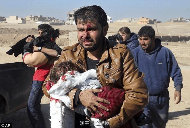 近日IS在摩苏尔al-Tahrir地区持续发射炮弹,仅一个早晨便造成3名儿童死亡,超过20人受伤。一位伤心欲绝的父亲抱着自己女儿的遗体在医疗队痛哭,被IS炸死的女婴仅15个月大,被IS的炮弹击中了脑袋,当场死亡。