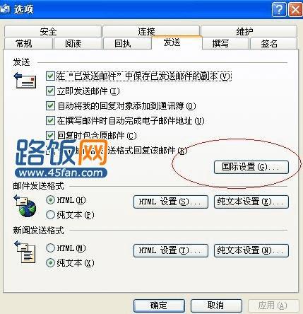 2、点击“国际设置”,进入“发送邮件的国际设置”选项,取消“将默认邮件方向设置为从右向左(S)。点击“确定”。