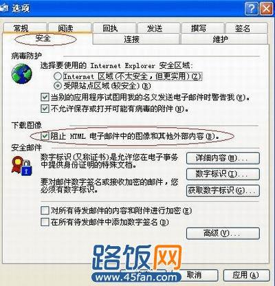 解决方法:打开Outlook Express,点击工具---选项---安全选项,将“下载图象”的“阻止HTML电子邮件中的图像和其他外部内容(B)。”勾选去除即可。如下图所示: