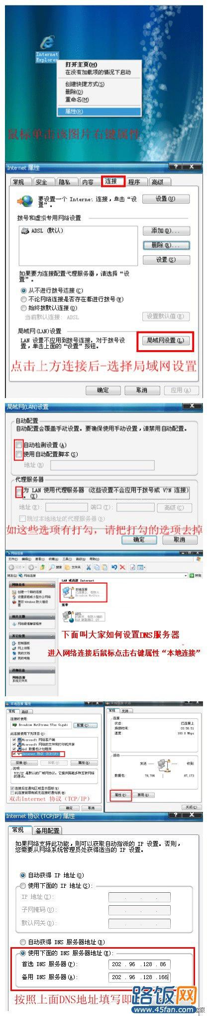 之前小编在本站多次同各位分享过《QQ能登陆但网页打不开》一文,其实出现这种问题是由于设置了代理服务器或DNS有误造成的,咱们下面就用一张图来教你解决网络连接正常,QQ可以登陆但网页打不开的情况,此文只针对电脑小白,如果您是老鸟,请绕道哦~~~~~~呵呵。