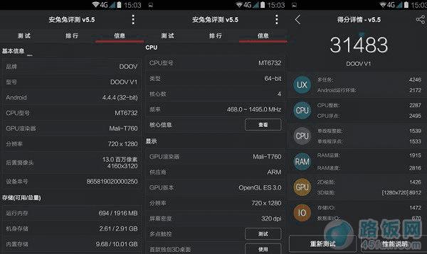 豆逆客手机硬件配置属于主流级别,搭载的CPU和RAM内存并不算特别出色。土豆逆客手机搭载的是最新联发科颗MT6732四核处理器(64位),运行2GB内存以及16GB存储空间,通过安兔兔V5.5跑分软件测试,其性能跑分成绩如下。