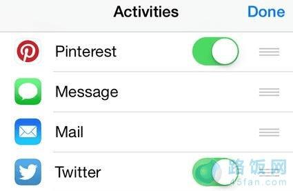 现在,你终于可以重新排列iOS系统中的分享服务列表了,可以把最常用的应用排在最前面。比方说,如果你是Pinterest的狂热用户,把Pinterest放在苹果自带的消息和电子邮件应用之前,就能无需滑动翻页轻松分享至Pinterest。对分享服务列表进行定制很简单,只需在分享菜单弹出时点击“更多”( more)图标即可。此外,底部的“添加书签”或“用作墙纸”等动作的顺序也可以重新排列。