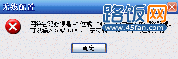 在连接无线网络中,输入无线网络密码后,提示"网络密码必须是40位或者104位",如下衅所示: