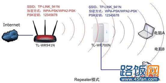 无线路由器设置Repeater模式,作为前端无线设备的中继放大,首先与主AP建立无线连接,接着将主AP的无线信号发送出去,如下图所示: