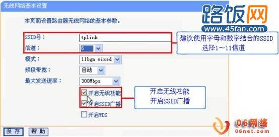 2、使用网线将电脑和路由器连接起来,然后登录路由器的WEB管理界面,在无线设置——基本设置,确认SSID非中文,信道在1~11之间,无线功能已开启,SSID广播已开启。点保存,并重启路由器。如下图示: