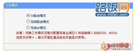 1、打开无线路由器的WEB管理界面。在IE地址栏中输入192.168.1.1,在弹出的用户名和密码框中输入正确的数值后(可参见无线路由器背面铭牌用户名和密码)。点击“设置向导”,选择“下一步”,设备可选的有3 种上网模式:3G路由模式、无线路由模式、无线AP模式,默认为3G路由模式。