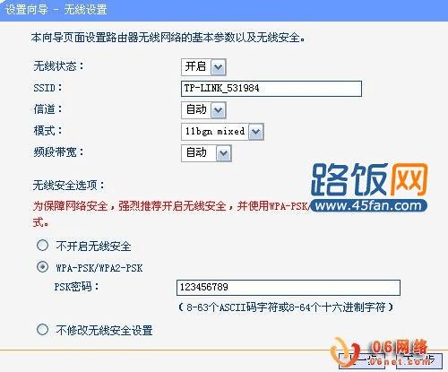 3、点击“下一步”设置无线安全。设置步骤基本上同普通无线路由器设置方法相同,如下图所示: