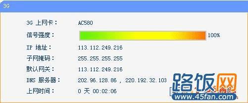 4、设置完成之后,点击“下一步”,重启路由器,等待1-3分钟,查看设备“运行状态”——“3G”,可以看到路由器已经获取到IP地址等上网必需的参数,说明路由器拨号已经成功,如下图,此时您就可以正常上网了。
