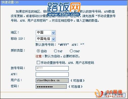 2、这里我们选择“3G路由模式”,点击“下一步”,配置3G拨号参数,地区选择“中国”,移动ISP:可选“中国电信”、“中国移动”和“中国联通”(根据你的上网卡制式来选择),其他默认设置不用修改。