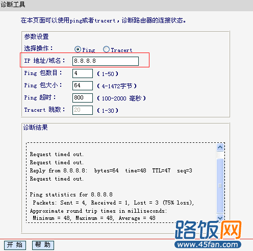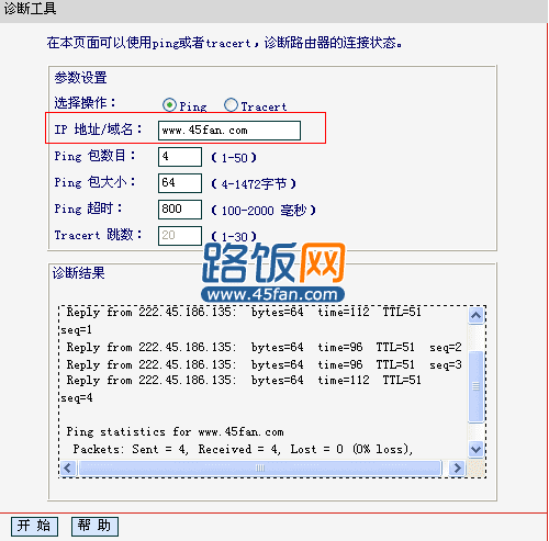 3、如果你需要ping 域名,如www.45fan.com,方法同上一样,输入相应域名即可。