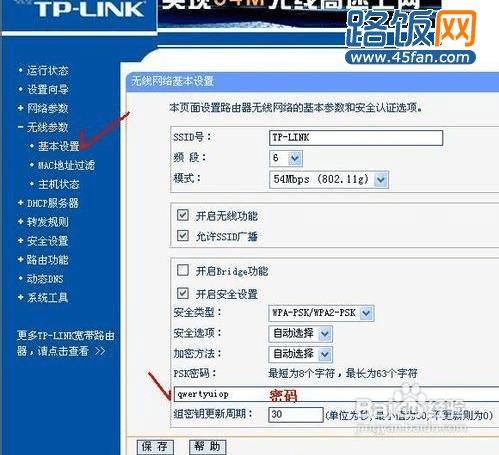 4、下图是无线路由器加密方式设置,包括SSID号、频道、模式设置等。当然还需要设置加密方式,如采用WPA-PSK/WPA2-PSK,设置加密密钥及开启无线功能。