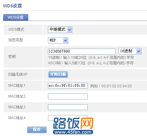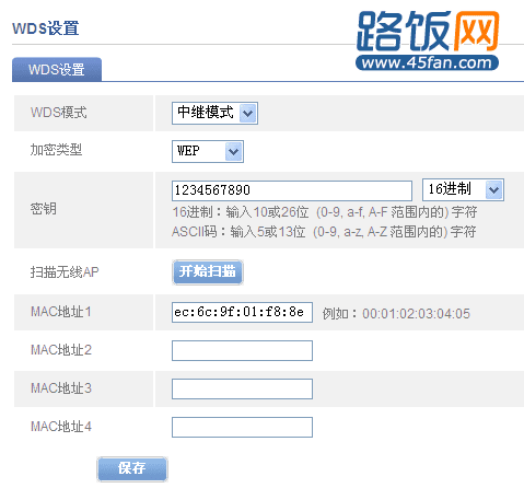 3、进入R1路由器,WDS设置下WDS模式改为中继模式,加密类型选择所需类型,可以是WEP、也可以是WPA/PSK(这里以WEP为例),然后输入密钥。点击开始扫描,找到R2后,保存-重启即可。