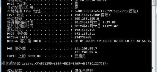 3、添加广电的DNS(查找DNS方法:在“开始”-“运行”中输入cmd,点确定或按回车键,输入 ipconfig /all (或ipconfig -all)按回车键,在DNS 服务器后面的两排数字就是。我搜索出来的连云港广电的DNS为111.208.55.7和111.208.55.6(不知别家的是不是一样),如下图所示。