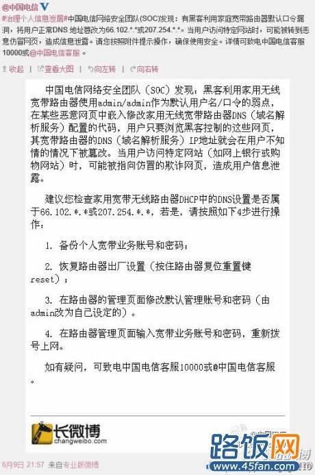 今天,中国电信网络安全团队发布消息称有黑客利用宽带路由器默认用户名和密码漏洞,将用户正常上网DNS篡改为以66.102.*.*开头或207.254.*.*开头的地址。当用户在不知情的情况下,使用这类DNS地址访问网页,会被转到黑客事先制作好的恶意网站上去,从而造成用户信息泄露。