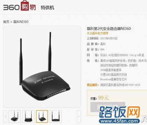 继上周宣布推出“随身WiFi”设备后,360公司向磊科定制的安全路由器NI360也将于26日发售,初步定价为99元。而在360购物网页上,这款路由器已经被挂出展示,从详尽的规格参数和产品照片中可以看出360方面已经做好了发售的准备。