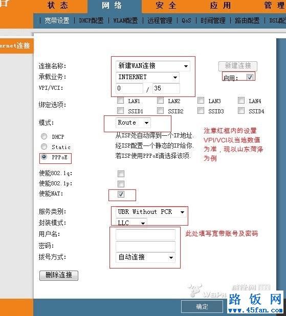 然后新建第一个连接 就是你抄的第一个 这里我们不同的是 你只需输入你自己的VPI/VCI
