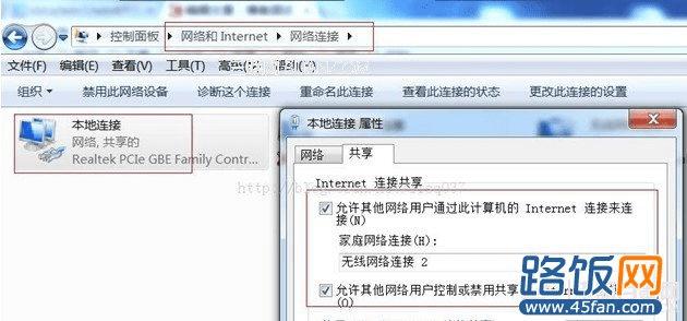 右键打开本地连接,打开共享标签卡,按下图方式设置,设置成功后,本地连接将显示为【网络,共享的】