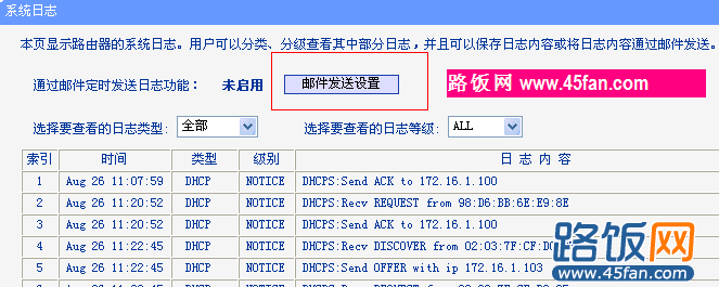 3、在右侧的系统日志框下,可查看日志类型及当前日志内容,点击“邮箱发送设置”,如下图所示: