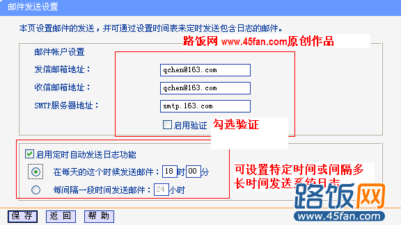 4、进入“邮件发送设置”界面下,输入发送邮箱地址、接收邮箱地址和SMTP服务器地址并勾选启用验证,如果需要定时发送系统日志,还可以根据特定时间或者间隔一段时间,如24或48小时发送一次,则勾选启用定时自动发送日志功能。如下图所示: