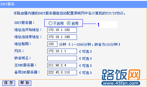 2、进到路由器WEB界面后,点左侧的“DHCP服务器”进入DHCP服务设置界面并启用该服务,如下图所示: