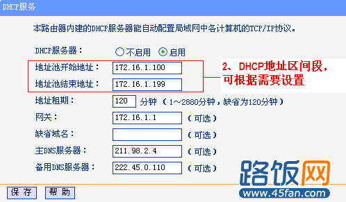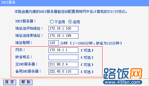 3、启用DHCP服务器,然后输入起始地址,如172.16.1.100为第一个要分配的地址,接着输入结束地址,如172.16.199,那DHCP地址段区间为172.16.1.100~172.16.1.199。如下图所示: