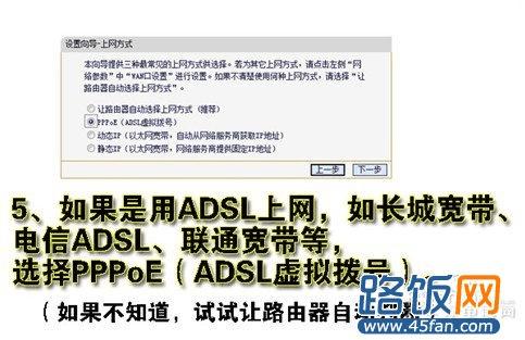 根据设置向导一步一步设置,选择上网方式,通常ADSL用户则选择第一项PPPoE,如果用的是其他的网络服务商则根据实际情况选择下面两项,如果不知道该怎么选择的话,直接选择第一项自动选择即可,方便新手操作,选完点击下一步。