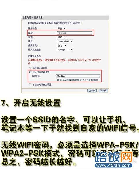 接下来进入无线设置,设置SSID名称,这一项默认为路由器的型号,这只是在搜索的时候显示的设备名称,可以根据你自己的喜好更改,方便搜索使用。其余设置选项可以根据系统默认,无需更改,但是在网络安全设置项必须设置密码,防止被蹭网。设置完成点击下一步。