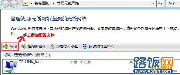 在上述配置界面中我们可以看到已经有了一个无线网卡的配置文件,这是由于之前此电脑曾经接入过无线网络,系统会为无线网卡自动保存一个配置文件。双击“TP-LINK_fae”可以查看此配置文件的详细信息。当然您也可以手动添加一个无线网卡配置文件。如下图所示: