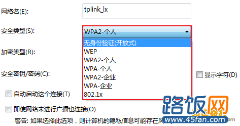 在上述配置界面中会提示我们输入无线信号的一些参数,比如在路由器上设置的网络名(SSID号)、加密类型等等。其中支持的加密类型有以下几种: