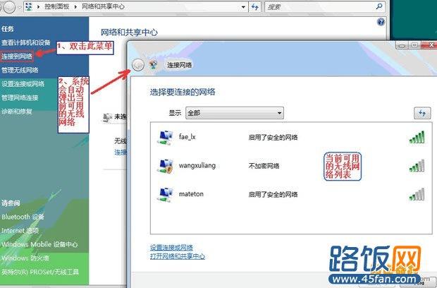 首先、打开“网络和共享中心”,双击左侧的“连接到网络”菜单,此时系统会弹出当前可用的无线网络。如下图所示: pdfgoword.com