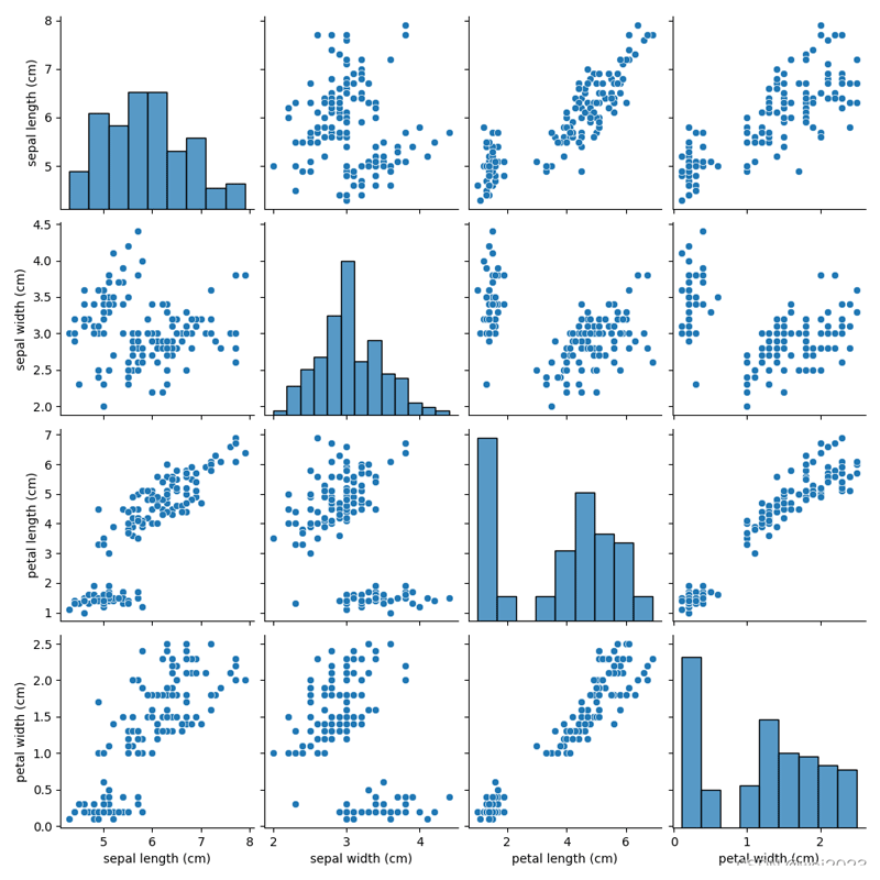 经过hue分类后的pairplot中发现,不论是从对角线上的分布图还是从分类后的散点图,都可以看出对于不同种类的花,其萼片长、花瓣长、花瓣宽的分布差异较大,换句话说,这些属性是可以帮助我们去识别不同种类的花的。比如,对于萼片、花瓣长度较短,花瓣宽度较窄的花,那么它大概率是山鸢尾