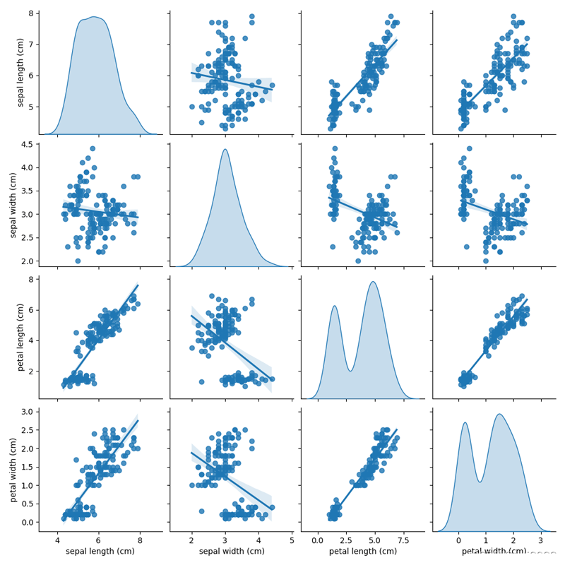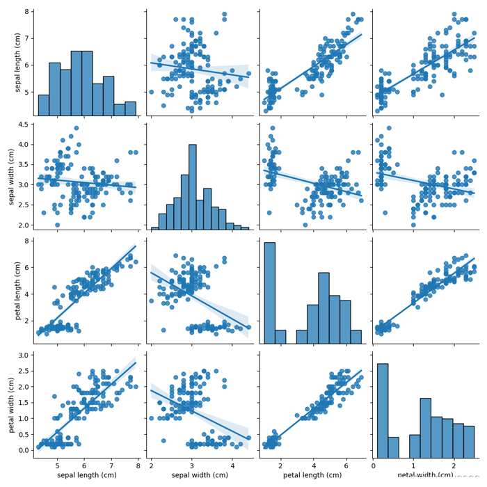# No.2 #kind:用于控制非对角线上图的类型,可选'scatter'与'reg' #diag_kind:用于控制对角线上的图分类型,可选'hist'与'kde' sns.pairplot(iris_data, kind='reg', diag_kind='kde') sns.pairplot(iris_data, kind='reg', diag_kind='hist')