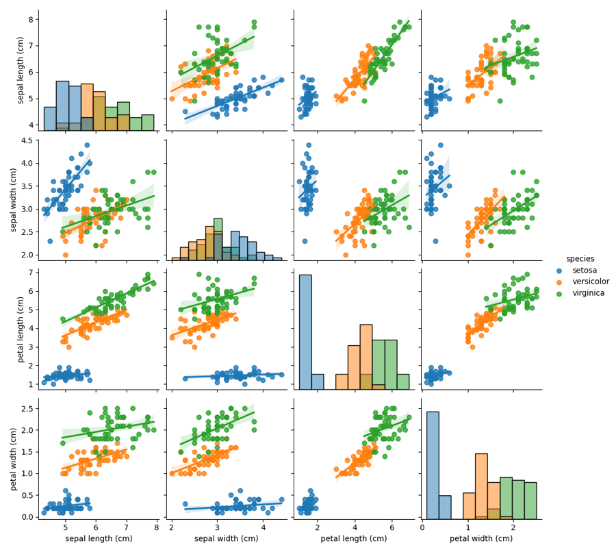 # No 3 # hue:针对某一字段进行分类 sns.pairplot(iris_data, hue='species', kind='reg', diag_kind='hist')