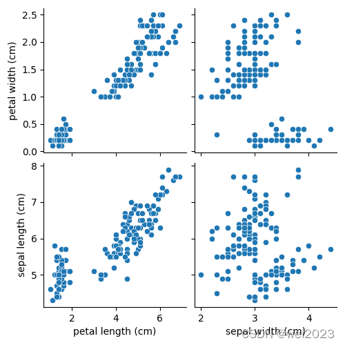 # No 4 # vars:研究某2个或者多个变量之间的关系vars, # x_vars,y_vars:选择数据中的特定字段,以list形式传入需要注意的是,x_vars和y_vars要同时指定 sns.pairplot(iris_data, vars=["sepal length (cm)", "sepal width (cm)"]) sns.pairplot(iris_data, x_vars=["petal length (cm)", "sepal width (cm)"], y_vars=["petal width (cm)", "sepal length (cm)"])