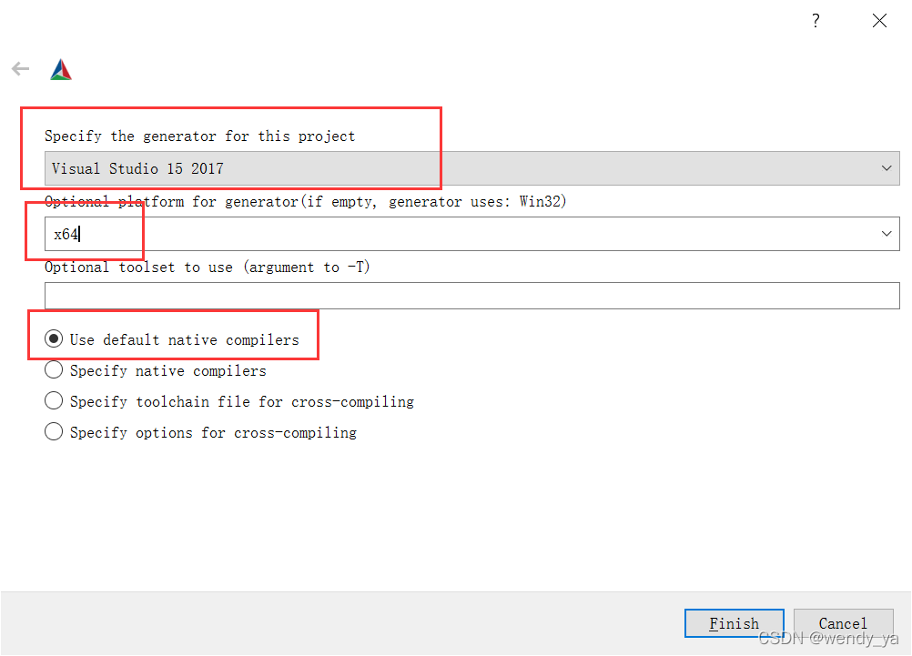 这里选择你使用的编译器(我这里使用的是Visual Studio2017),然后在下方输入x64: