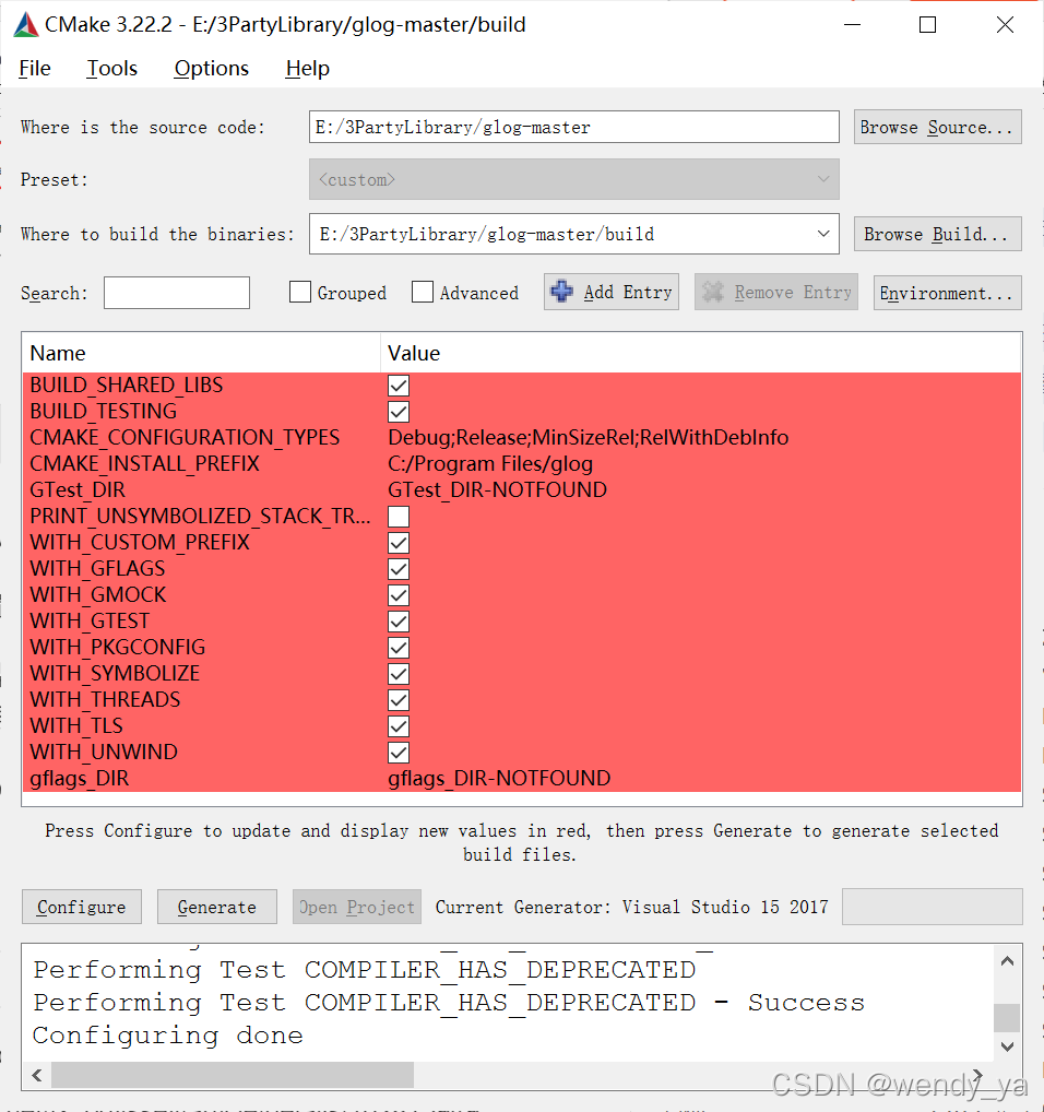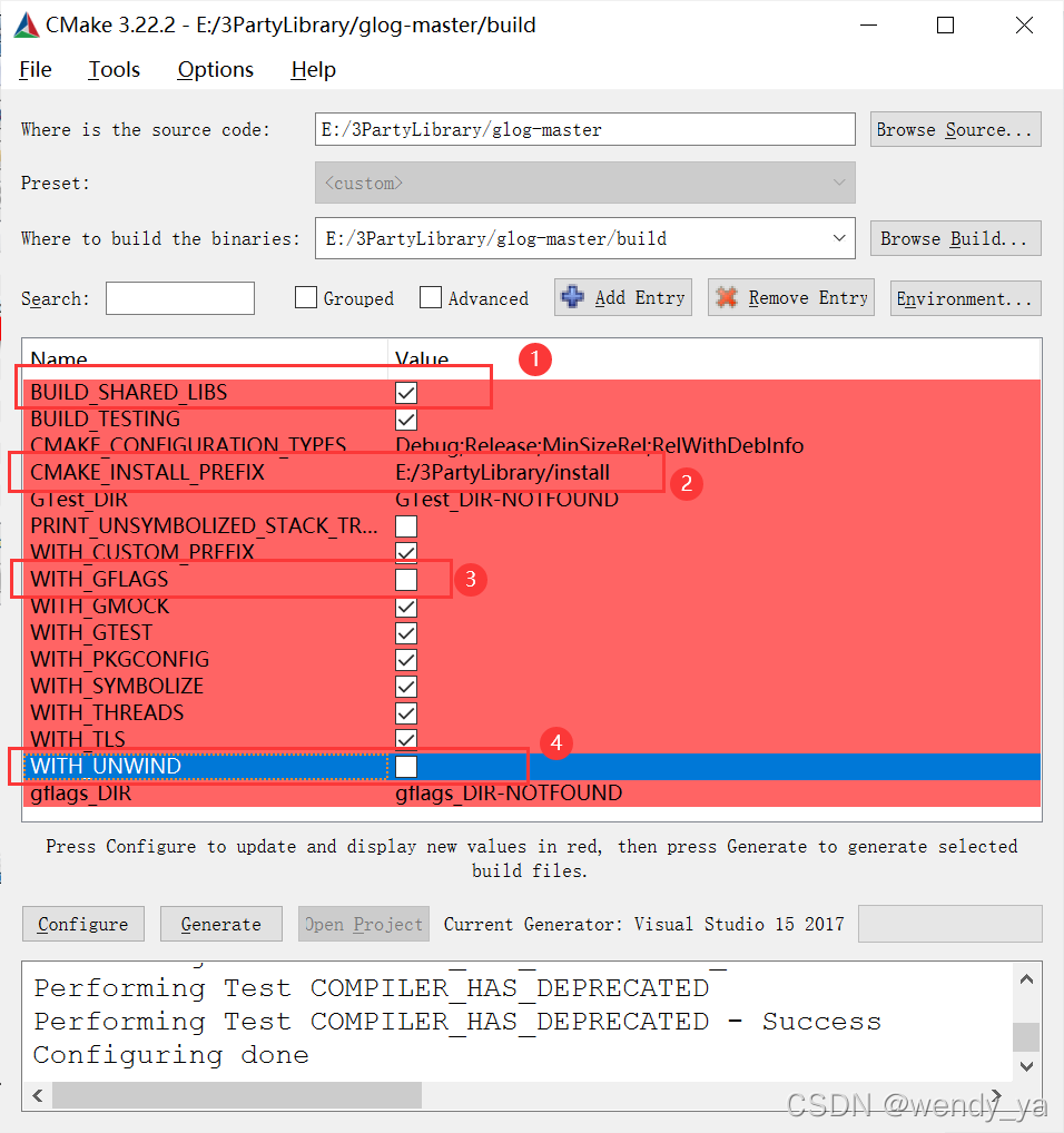 ③和④分别是WITH_GFLAGS和WITH_UNWIND,这两个我也不是很清楚是做什么的,但是如果把这两个勾上的话,在cmake的过程中就会报warning,因此都不勾。