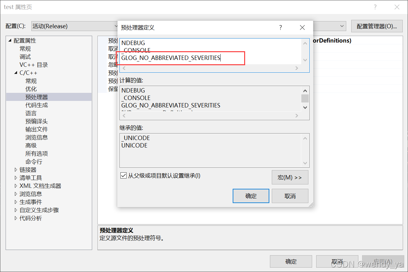 除了上述在前三行加入代码外,也可以选择添加预处理项。项目属性 ——> c/c++ ——> 预处理器。 添加GLOG_NO_ABBREVIATED_SEVERITIES。