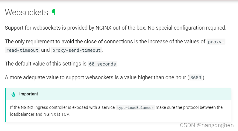 ingress nginx默认支持websocket协议,使用长连接协议时需要注意连接超时的设置,读取和发送超时的注解参数分别是:nginx.ingress.kubernetes.io/proxy-read-timeout和nginx.ingress.kubernetes.io/proxy-send-timeout。