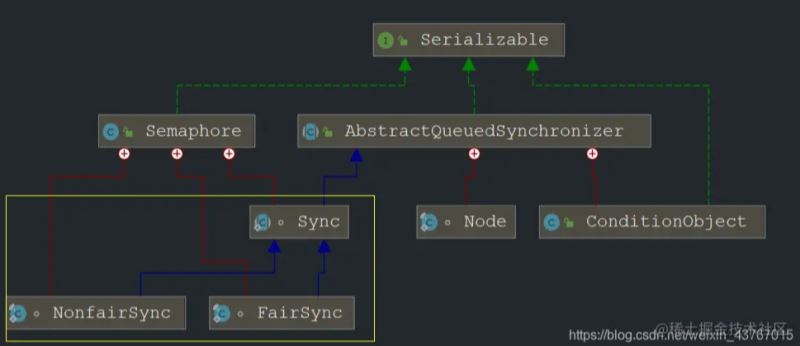 根据uml类图,可以很明显的看出来Semaphore和CountDownLatch一样都是直接使用AQS实现的。区别就是Semaphore还分别实现了公平模式FairSync和非公平模式NonfairSync两个内部类。