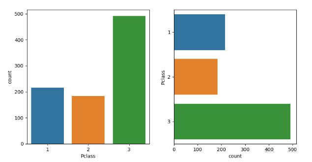 #ax指定子图 fig, ax = plt.subplots(1, 2, figsize=(10, 5)) sns.countplot(x='Pclass', data=titanic, ax=ax[0]) sns.countplot(y='Pclass', data=titanic, ax=ax[1]) plt.show()