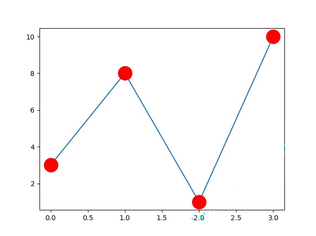 import matplotlib.pyplot as plt import numpy as np ypoints = np.array([3, 8, 1, 10]) plt.plot(ypoints, marker = 'o', ms = 20, mec = 'r', mfc = 'r') plt.show()