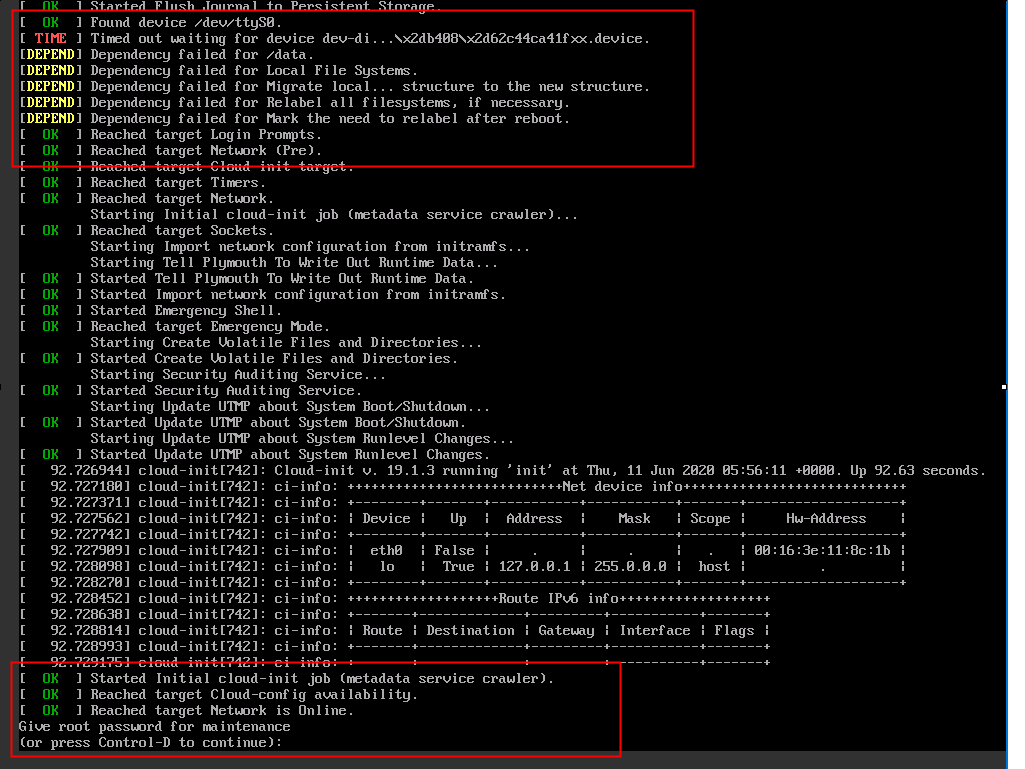 通过远程连接软件无法登录Linux实例,通过使用管理终端连接Linux实例远程连接时,发现系统出现进入到急救模式(emergency mode)的信息,且出现报错。