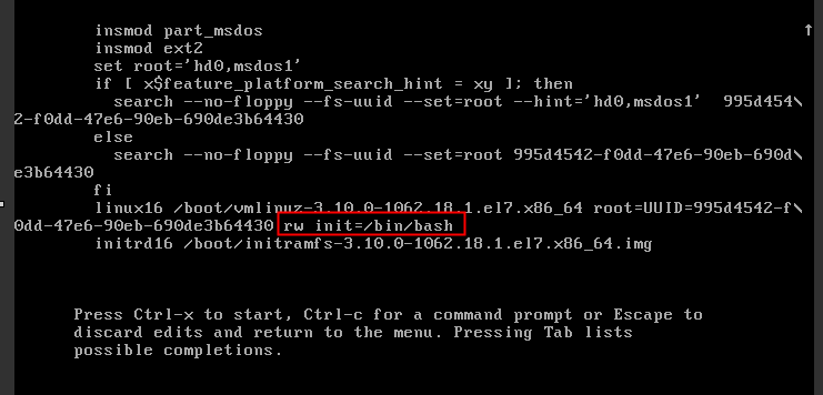 rw init=/bin/bash参数,如下图所示,然后按Ctrl和x键,进入单用户模式。